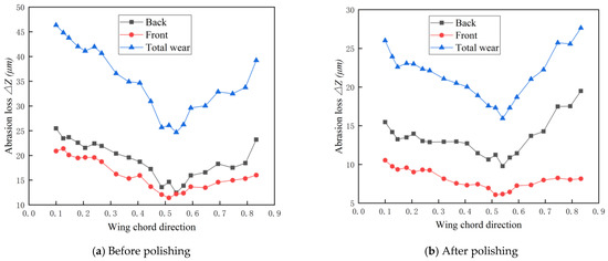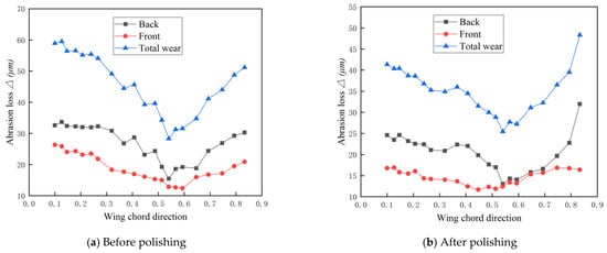 The wear amount of the guide vane at different blade heights in the wing chord upward was obtained through the test. Considering the influence of the side wall effect, the average of 40–60% wear amount of all the inscribed points on the front and back of the guide vane was taken as the wear amount of each inscribed point for the life estimation of the guide vane, and some inscribed points with the incorrect measurement or that were difficult to measure were deleted, and the wear amounts of different wing chords upward were obtained, as shown in Figure 22, Figure 23 and Figure 24. According to Figure 22, Figure 23 and Figure 24, the maximum wear amount of the guide vane before and after polishing and spraying tungsten carbide can be obtained. From the test of the effect of water temperature on the wear of guide vane, it can be seen that the guide vane of the power station is affected by sediment wear differently in the flood and dry water periods, so the difference of the wear of the guide vane in different wing chord upwards under two water temperatures is extracted for calculation, as shown in Table 6. The specific service life of the guide vane can be obtained by substituting the data in Table 6 into Equation (1), as shown in Table 7.