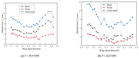 (a,b) Wear on the chord of different airfoil types (P = 42.8 MW).