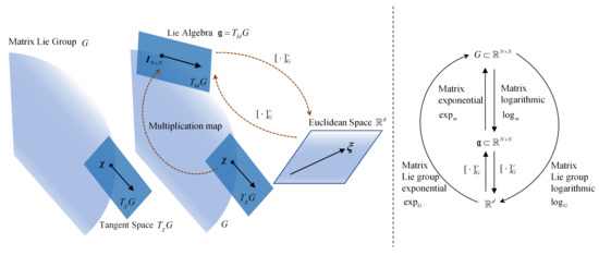 Lie algebra: Let denote the Lie algebra associated with a d-dimension Lie group; there is . As Lie groups and Lie algebras lack mathematical tools, one needs to identify Lie algebra to Euclidean space for convenient calculation. There is a linear bijection between and , i.e., . This linear bijection is invertible, and its inverse map is defined by . For example, assume vector and Lie algebra ; then, we have and . The middle plot of Figure 1 gives a more intuitive illustration.