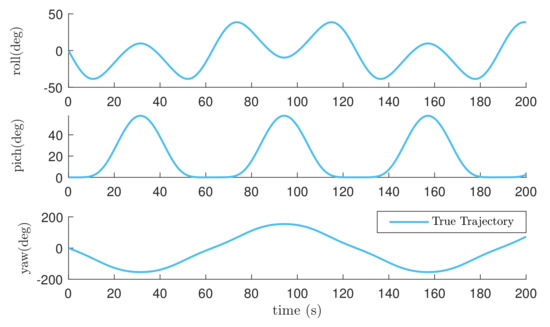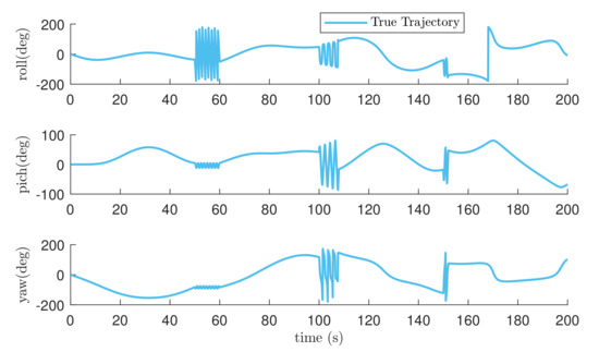 To evaluate estimation quality, numerical simulations were carried out. In the simulations, we selected the north–east–down frame as the navigation frame. The attitude trajectory that lasted 200 s was generated by . The true trajectory without noise and bias is shown in Figure 2. Gyroscope bias was , and gyroscope noise was white Gaussian noise subjected to . Two known corresponding measurement vectors in the navigation frame are and , where is the gravitational acceleration. The noises of the accelerometer and the magnetometer are white Gaussian noise and follow and , respectively. Some sensor parameters are provided by [42]. For filtering, we set the initial covariance matrix as and the initial gyroscope bias as . The kernel scale and kernel length that constituted the kernel parameters were selected to be and .