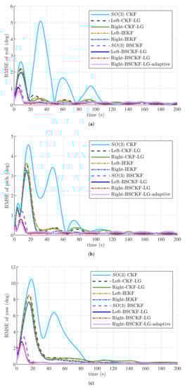 RMSEs of Euler angles in Case 3. (a) RMSEs of roll angle; (b) RMSEs of pitch angle; (c) RMSEs of yaw angle.
