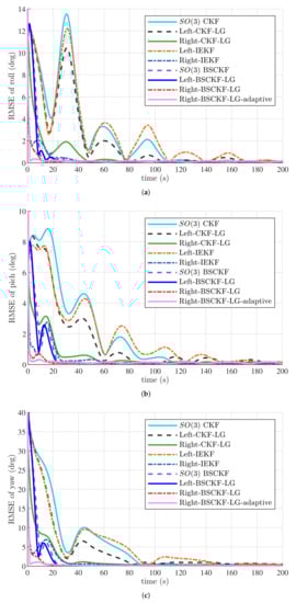 Simulation results of Case 1 are illustrated in Figure 3 and Table 1. Figure 3 compares the RMSEs of the Euler angles, while Table 1 summarizes the corresponding ARMSEs. With small initial attitude errors, the proposed BSCKF-type filters with cubature points performed better than other filters did and needed less time to reach a steady state. Right-BSCKF-LG and its adaptive version obviously outperformed the other filters. Simulation results also verified that the performance of Right-IEKF and Right-CKF-LG was similar and slightly better than that of Left-IEKF and Left-CKF-LG under small initial estimation errors. The selection of sliding window size could affect the estimation accuracy of Right-BSCKF-LG-adaptive, and the filtering accuracy of Right-BSCKF-LG-adaptive was not significantly better than that of Right-BSCKF-LG.