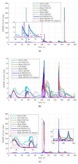 For each case, we conducted 100 independent Monto Carlo simulations and utilized the following root-mean-square error (RMSE) and averaged RMSE of the Euler angles (roll, pitch, yaw) to evaluate estimation quality: