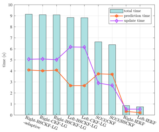 Figure 7 exhibits the computation times of the compared filters. CKF-LGs and BSCKF-LGs spent more computation time, while IEKFs spent minimal time. When the Bayes–Sard weights were calculated in advance according to the known system-state and measurement dimensions, the computation costs of BSCKF-LGs are almost equal to those of CKF-LGs. Right-BSCKF-LG-adaptive did not significantly increase the computational burden compared with Right-BSCKF-LG. Overall, BSCKF-LGs showed more accurate and robust estimation results in this attitude estimation example.