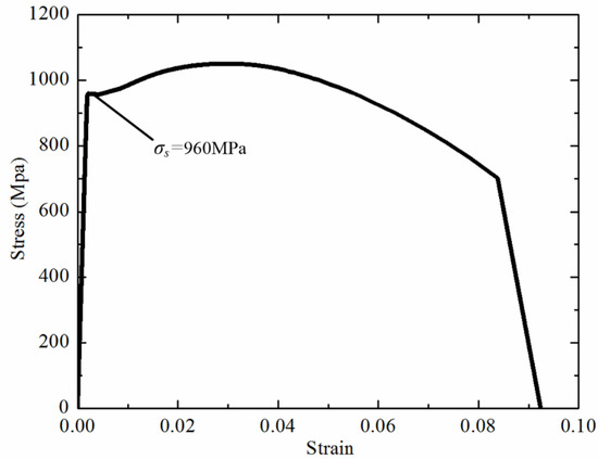 High-cycle fatigue failure is usually not considered in disposable HD, but low-cycle failure should be emphasized. Medium-carbon alloy steels, such as 40Cr, 40CrNiMo, and 30CrMnSiA, are the first choice for flexible wheels. Cr, Ni, Mo, Mn and Si can refine metal grains so as to improve the stiffness and toughness of steel. In this paper, 40CrNiMoA under a quenching–tempering process was selected as the disposable flexible wheel material. The stress–strain curve obtained by the tension and compression test of 40CrNiMoA is shown in Figure 3, and the yield strength σs was determined as 960 MPa.