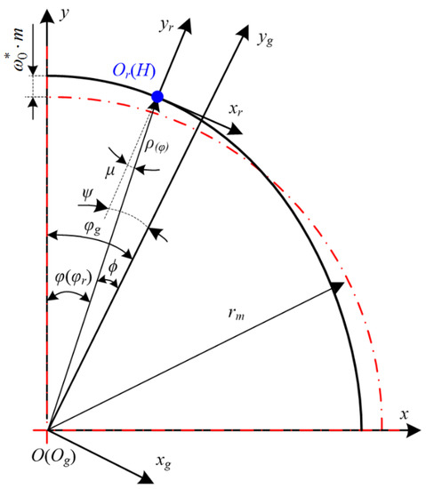 Based on the above assumptions, on the premise that the flexible tooth profile and the shape of the wave generator have been determined, the envelope method is used to calculate the rigid tooth profile (see Figure 4). There are three coordinate systems in Figure 4: the wave generator coordinate system C(O; x, y, z), the flexible wheel coordinate system Cr(Or; xr, yr, zr), and the rigid wheel coordinate system Cg(Og; xg, yg, zg). O and Og coincide with the rotation center of the harmonic drive, while Or is the intersection of the symmetry line of the deformed flexible tooth and the neutral layer of the flexible wheel rim. yr is the symmetry axis of the flexible tooth and yg is the symmetry axis of the rigid tooth cogging. The original curve before harmonic gear assembly was set as and the motion trajectory of a point on the original curve in Cg was defined as . Then, the envelope curve of the curve family when the flexible tooth profile moved along in Cg was the rigid wheel tooth profile.