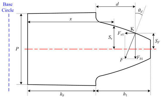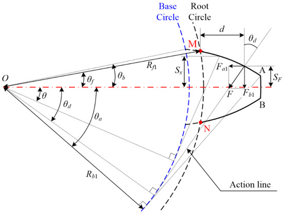 According to the characteristics of the involute curve, the angular position variable θ is introduced, and Sx and SF can then be expressed as follows: