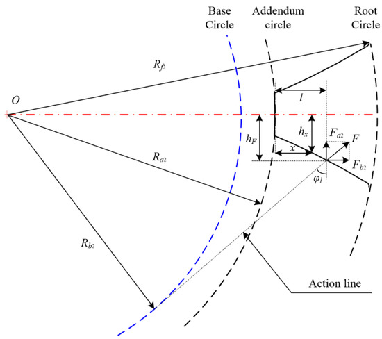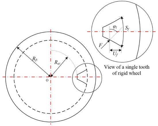 where hF denotes half of the thickness of the rigid tooth where the distance to the tooth top is l. According to the fitting curve of the rigid wheel obtained from Equation (9) in Section 2.2, hx and hF can be expressed as follows: