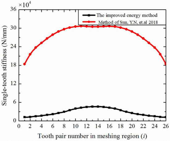The single-tooth stiffness of the disposable harmonic drive in the involute profile as obtained by the improved energy method is shown in Figure 12. The stiffness obtained by the improved energy method, proposed in this article, was compared with the stiffness calculated by the analytical method without considering the thin rim in Ref. [10], as shown in Figure 13.