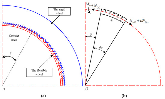 The equivalent model of the flexible wheel is shown in Figure 8. In this figure, AM and BN are the curves of the involute profile. The single-tooth model of the involute profile is shown in Figure 9. Along the action line, F can be decomposed into axial component Fa1 and radial component Fb1. Compression energy is generated under the action of Fa1, shear energy is generated under the action of Fb1, and bending energy is generated by a combination of Fb1 and the additional bending moment Mx1. Fa1, Fb1, and Mx1 can be calculated as: