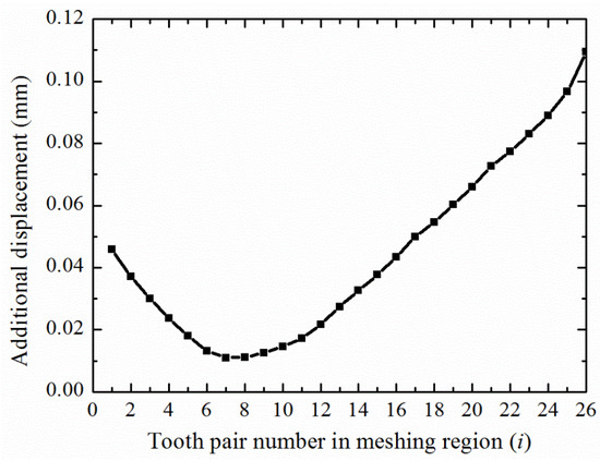 As shown in Figure 22, during one engaging-in and engaging-out cycle of a tooth pair in the meshing region of the disposable HD, the load on the teeth of the gear gradually increased to the peak value and then reduced. Additionally, the load peak was distributed in the middle gear teeth in the meshing region. With subsequent teeth meshing, the previous meshing teeth did not withdraw. Thus, the superposition of the elastic displacement of the teeth of the gear led to a gradual increase in the comprehensive displacement. The results of the modified analytical method described in Section 3 and the FEM were then compared (see Figure 23).