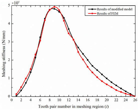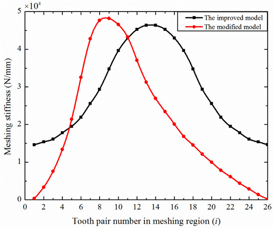As can be seen from Figure 6, the two curves were similar in amplitudes. However, the modified meshing stiffness curve was not symmetrical, and the tooth position with the largest stiffness in the meshing region was on the left side of the center line. This was due to the additional deformation of the flexible wheel teeth caused by the multi-tooth meshing of the disposable harmonic gear.