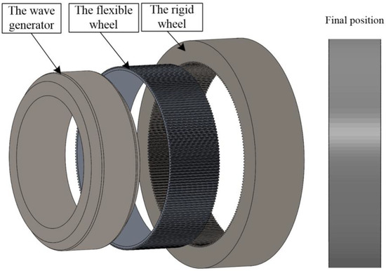 In step assembly, fix the flexible wheel and then move the other two components to the position matched with the flexible wheel at a uniform translation speed. In step loading, fix the rigid wheel’s external surface. Then, apply a constant rotation speed to the other two components. Additionally, apply a full load of 80 N·m to the flexible wheel.