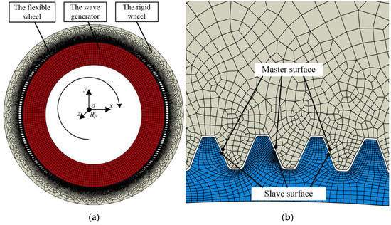 The simplified model for the finite elements of the disposable HD is shown in Figure 17. The finite element analysis included two stages of assembly and loading. In order to apply boundary conditions and loads, reference points were set up at the center positions of the three components. Then, coupling constraints on the flexible internal surface, the external surface of the rigid wheel, and the wave generator with the corresponding reference points were established. The wave generator was treated as completely rigid during simulation. The FEM contained two types of contact: contact between the flexible internal surface and the external surface of the wave generator, and contact between the tooth surfaces of the two gears. The internal surface and the tooth surface of the flexible wheel were set as the slave surface, and the wave generator external surface and the rigid tooth surface were set as the master surface.