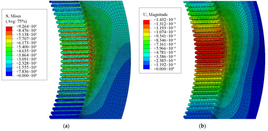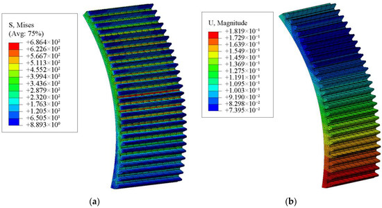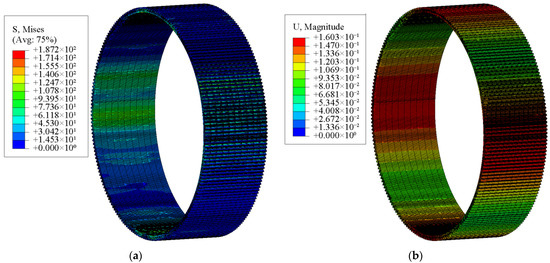 (a) Equivalent stress of the flexible wheel after loading; (b) equivalent deformation of the flexible wheel after loading.