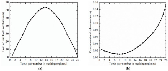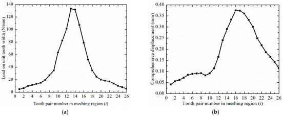 (a) Load on the width of the unit tooth of each node in the meshing region; (b) comprehensive displacement of each node in the meshing region.