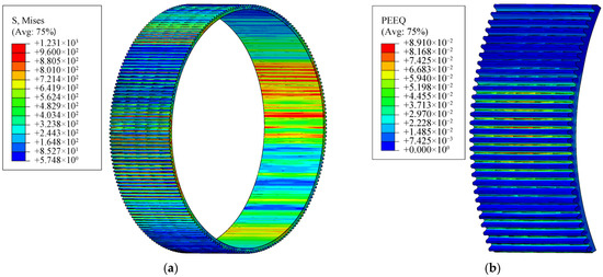 (a) Equivalent stress of the flexible wheel in case of overload; (b) plastic strain of the flexible wheel in case of overload.