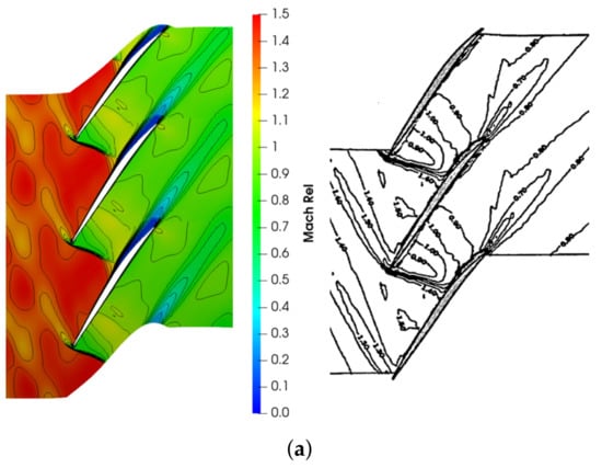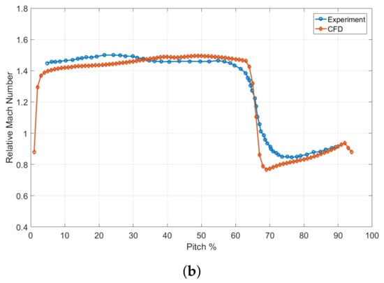 Numerical code validation against experimental results from [29]. (a) Relative Mach number contours at span obtained with the CFD code (left) and experimentally (right). (b) Relative Mach number along the pitch at span and chord for the near peak efficiency condition.