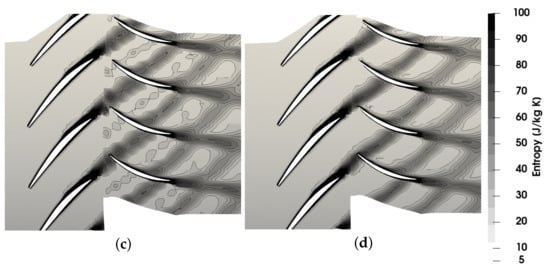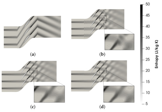 Entropy field obtained with the three different methods and different number of harmonics included in the flow spectrum. (a) Steady-state frozen rotor; (b) 1 Harmonic; (c) 3 Harmonics; (d) DTS.