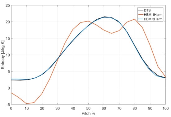 This non-physical effect is inherently linked to the steady-state nature of the calculation and is due to the change in the relative frame of reference at the interfaces. On the other hand, for the transient case (Figure 2d), thanks to the mesh motion, the incidence angles are correctly preserved across the interface. The HBM aims to mimic this behaviour without resorting to a transient simulation, by simply coupling a set of steady-state simulations. When a single harmonic is retained in the flow spectrum, the results are reported in Figure 2b. It can be noticed that the mere addition of a single harmonic to the mean flow is not sufficient to reconstruct the wakes shape, although they are now correctly aligned across the interfaces. In general, the thinner are the wake, the greater is the number if harmonics necessary to reconstruct their shape [33]. When three harmonics are included in the frequency set, the situation improves dramatically, as can be seen by the comparison of Figure 2c with the reference solution in Figure 2d. The inlet entropy wave and the rotor wake are correctly transferred across interfaces and their interaction in the downstream region is well captured. The entropy “bubbles” due to the poor resolution of the flow spectrum disappear, as highlighted by the close-ups in the figures. When a small number of harmonics are retained, under and overshoots can be produced, leading to non-physical values of flow quantities. This can be seen in Figure 3, where the entropy at location A (Figure 4) is plotted as a function of the pitch. The HBM solution with one harmonic is not capable of reproducing the entropy distribution across the pitch, resulting in some values falling below zero at the wake edge. On the contrary, excellent agreement is found between the three harmonics and the DTS solutions, although the former has been found to be about seven times cheaper than the latter in terms of CPU times.
