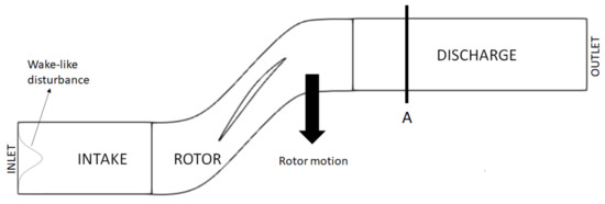 where and . and are the total pressure and total temperature deficits, which have been selected according to the realistic values of 0.025 and −0.007, respectively, proposed by Gomar et al. [33]. L is the wake width and has been selected as of the blade pitch. This non-uniform perturbation in the absolute frame is seen by the rotor as a travelling disturbance with a frequency equal to the BPF. At the same time, the rotor wake represents a travelling disturbance with the same frequency in the discharge region. We are interested in reproducing the correct behaviour of this entropy disturbances in the whole domain, as well as their interaction in the discharge region. This can be accomplished by the use of either time-resolved or HBM simulations.