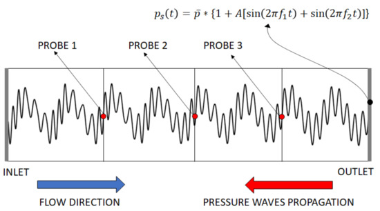 Since the flow is subsonic throughout the channel, the objective is to observe the propagation of pressure waves from the outlet as depicted in the sketch of the domain in Figure 5. The nonlinearity of the flow triggers other frequencies in the flow spectrum as the waves propagate towards the inlet. These frequencies need to be included in the input frequency set for the HBM simulation. Strictly speaking, due to the quadratic nonlinearity of the NS equations, infinitely many frequencies are produced in the flow spectrum. These frequencies are all the linear combination of and and all their harmonics. For practical purposes, the array of solved frequencies is truncated to . In this case, the algorithm described in Section 4.1 produces a condition number of the Fourier matrix equal to . In the authors’ experience, values around or below can be considered satisfying for the simulation. The pressure signal is probed at three locations at , and of the channel length, respectively, as show in Figure 5. Then the outcomes from the DTS and the HBM simulation are compared. The flow field at the desired time instants and locations for the HBM calculation can be easily reconstructed from the resultant flow spectrum through an inverse Fourier transform once the simulation has converged. The comparison is reported for each probe in Figure 6 over one period . It can be seen that the overall agreement between the two methods is good, especially for the third probe. This is to be expected, since it is the closest to the origin of pressure disturbance and therefore its spectrum is the sparser than the other two probes [34]. On the other hand, the spectrum at probe 1 location is richer and more complex, resulting in pressure peaks slightly overpredicted with respect to the DTS method. Still, the agreement is considered satisfactory throughout the channel and the method is considered validated.