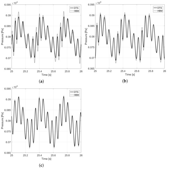 Comparison between HBM and DTS for the pressure signal registered by the three probes for the channel flow test case. (a) Probe 1. (b) Probe 2. (c) Probe 3.