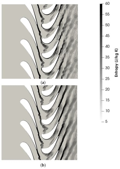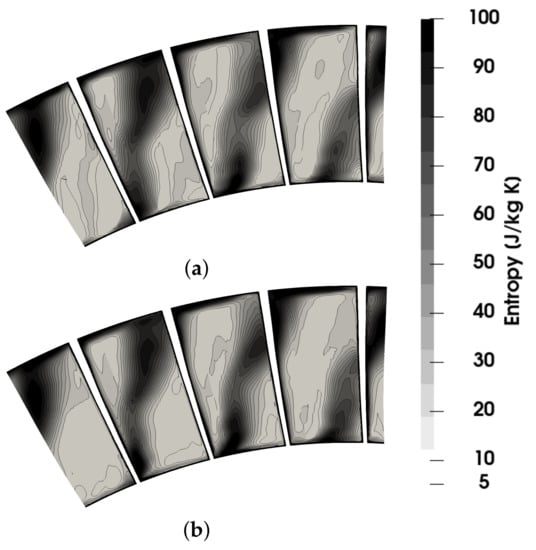 Comparison of entropy contours for the axial turbine stage test case. (a) Five harmonics. (b) DTS.