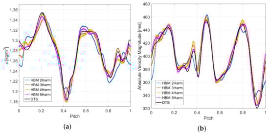 Instantaneous flow quantities in front of the rotor blades as a function of the blade pitch for the DTS and HBM simulations. (a) Density. (b) Absolute velocity magnitude.