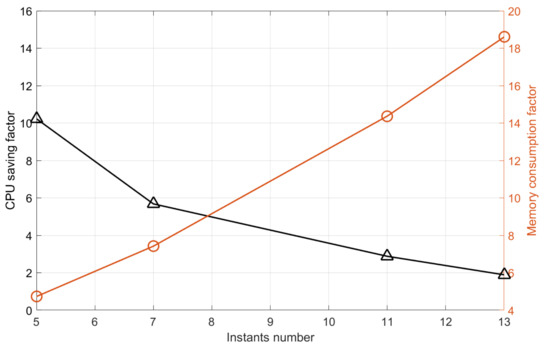 Following Algorithm 2, the implementation of the coupling is straightforward, since no complex non-reflecting boundary conditions or interpolation steps are necessary at blade row interfaces. It is instead sufficient to include a loop to find the maximum condition number among all rows for each test time period . This is the variable to minimize using Algorithm 2. Another minor drawback is that, in theory, with the non-synchronized approach, one could use a different number of snapshots in each zone (i.e., for each row) of the domain. This could speed up the calculation when it is known that the flow spectrum in some region is more sparse. Of course, this is no longer possible with the synchronized approach, where the selected number of snapshots is used throughout the whole domain.