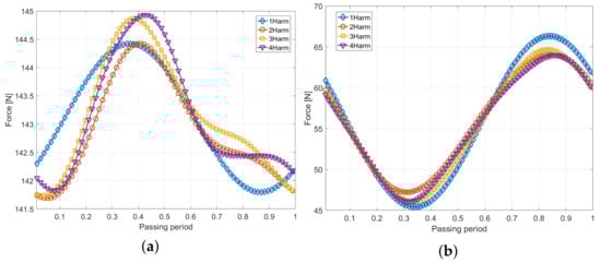 Evolution of forces on stator and rotor blades over one passing period. (a) Rotor. (b) Stator.
