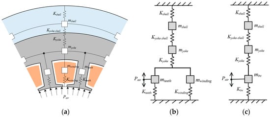 As shown in Figure 2a, the mechanism of high-frequency electromagnetic vibration of the stator assembly is as follows. The radial and tangential components of the magnetic density in the air gap of the motor interact with each other, which not only generates a tangential force density that produces torque, but also generates radial harmonic electromagnetic force. These radial electromagnetic forces of various spatial orders and temporal frequencies act on the stator teeth, which cause the teeth to vibrate forcibly. The stator yoke and the casing, which are rigidly connected to the stator teeth, will also vibrate accordingly. When the spatial order and temporal frequency of the radial electromagnetic force are close to one natural mode of the stator assembly, resonance will occur. In the whole vibrating system, the armature winding is embedded in the stator core, which can be regarded as a flexible connection without considering the glue filling. In this case, winding can be regarded as an additional mass to the stator core [].