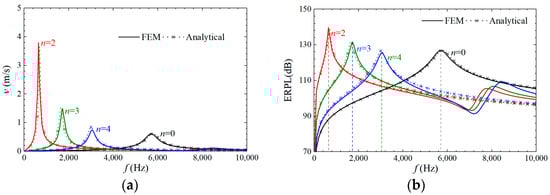 By substituting the motor size parameters shown in Table 1 into Equations (1)–(12), the transfer function of this 30 kW stator assembly can be obtained. It should be noted here that the damping ratio of the motor is obtained by experimental methods and empirical coefficients. Figure 4 shows the velocity and ERPL transfer function curve of each circumferential order mode to the air-gap electromagnetic unit force calculated by the ESN model. It can be found that with the increase of the spatial order, the corresponding natural frequency increases, while the velocity and ERPL amplitude, when the stator assembly resonates, gradually decreases. Therefore, in the electromagnetic vibration and noise analysis of the motor, the high-spatial-order air-gap electromagnetic force often does not need to be considered []. Meanwhile, an accurate structural-field FEM of the stator assembly was established, and the structural transfer function of each spatial order was also calculated to verify the accuracy of the ESN model, as shown in Figure 4. It can be seen that the calculation results of the ESN model are in good agreement with the FEM results, which verifies the accuracy of the ESN model.