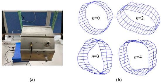 Modal hammering test of the stator with winding and shell: (a) stator assembly and test photos; (b) tested shape of each mode.