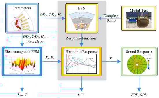 Step 1: Establish the IPMSM parametric model and define the size of the structural parameters. Then, transfer the stator structure parameters to the electromagnetic-field FEM and transfer the stator and the shell structure parameters to the ESN model.