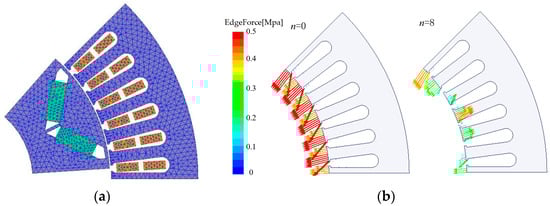 Two-dimensional electromagnetic FEM of IPMSM and electromagnetic-force distribution: (a) meshing of motor model; (b) distribution of radial electromagnetic force (n = 0 and n = 8).