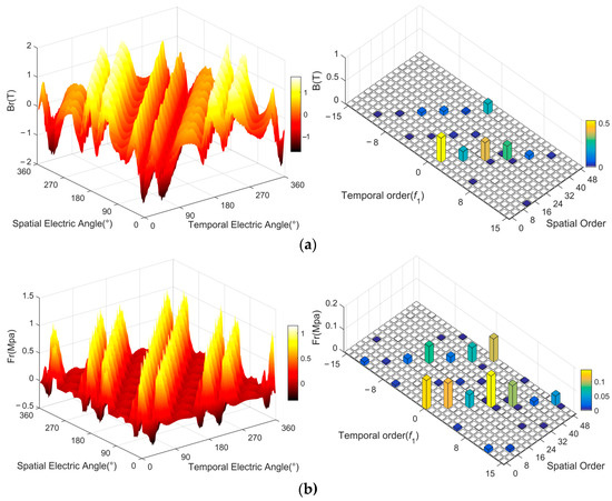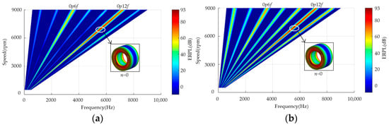 The performance of 2D Fourier decomposition on the air-gap flux density and radial electromagnetic force of the motor under rated operating conditions to obtain its harmonic distribution in temporal and spatial order is shown in Figure 8. It shows that for the integer-slot motor, in addition to the 0th-order spatial radial-force harmonic, the air-gap radial electromagnetic force has only a 2mp orders spatial harmonic (m = 1, 2, …, p is pole pairs). However, according to the above and [], it is difficult for the radial harmonic electromagnetic force of high spatial order to have a large vibration response that can be ignored. Therefore, in the integer-slot IPMSM, only the 0th-order spatial radial electromagnetic harmonic force is considered, which simplifies the calculation process.