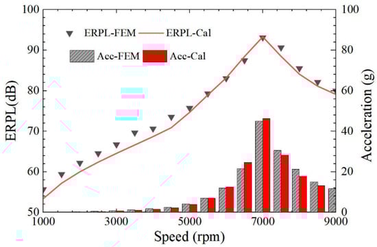 It can be seen from Figure 9 that the ERPL and acceleration results using the proposed ESN model agree with the FEM results, which verifies the accuracy of the ESN model. However, the ERPL spectrum calculated by the two methods is slightly different in Figure 10. The main reasons for the error are, first, to speed up the calculation and, according to previous research, the spatial electromagnetic-force harmonics of spatial order n > 4 are not considered in the proposed method. Second, the influence of the tangential electromagnetic force is not considered while the low-order tangential force will cause the tangential teeth to swing, and then cause radial vibration of the stator assembly. In fact, the amplitude of electromagnetic vibration noise generated by these factors is relatively small and does not affect the large change in the synthetic vibration noise, as shown in Figure 9.
