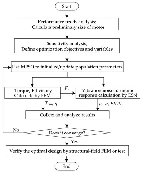 In this step, the modified particle swarm optimization (MPSO) in our previous research [] can be used to initialize and update the particle swarm population parameters. In the iterative process, the electromagnetic-field FEM is used to calculate peak output torque under different parameters, as well as the radial electromagnetic-force distribution of the air gap. At the same time, the vibration harmonic response is calculated using the proposed ESN according to Section 2. Then, the maximum vibration acceleration, ERPL, is obtained by the modal superposition method and the obtained electromagnetic-force distribution. The MPSO is used for iterative optimization until the design scheme converges.