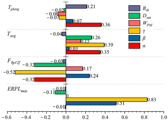 In this section, the analysis objectives are the output torque Tavg, the torque ripple Tpkavg, the amplitude of the tooth harmonic radial electromagnetic-force F0p12f of the key order (0th spatial order with 12th temporal times), and the maximum vibration ERPLmax caused by the air-gap radial unit force. The analysis variables are the stator slot opening width Bs0, stator outer diameter Dout, permanent-magnet width WPM, stator slot-tooth width ratio α, stator tooth-yoke thickness ratio β, and ratio of inner and outer diameter of stator γ.