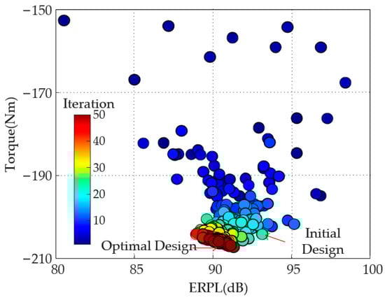 Through the above method, the performance of the 30 kW IPMSM is optimized for multiple iterations. Its maximum ERPL and maximum output torque are optimized, as shown in Figure 13. It can be seen that in this figure, as the optimization progresses, the population gradually approaches the direction of high torque output and low ERPL, and finally converges to a certain position in one space, forming the Pareto front and optimal solution set. It can be seen that through iterative optimization, the output torque of the motor gradually increases, while the vibration ERPL value, from the original around 93 dB, is reduced to 85 dB at maximum. From the Pareto front we can select the optimal solution according to the torque requirement and electromagnetic vibration ERPL. It is important to know that ERPL is calculated logarithmically, so the value does not change much before and after optimization.