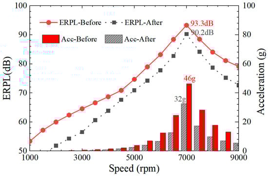 After the optimization process proposed above, the vibration and noise performances of the motor, such as acceleration and ERPL, are improved. Figure 14 shows the comparison of the ERP and acceleration of the motor under different speed conditions before and after optimization. It can be seen that its vibration acceleration at 7000 rpm decreases from 46 g to 32 g and the noise ERPL is also decreased, from 93.3 dB to 90.2 dB, and the vibration noise performance of the motor improves by about 30%, which verifies the effectiveness of the proposed optimization design method.