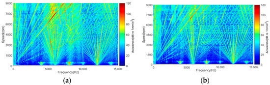 Comparison of the acceleration spectrum waterfall before and after optimization: (a) before optimization; (b) after optimization.