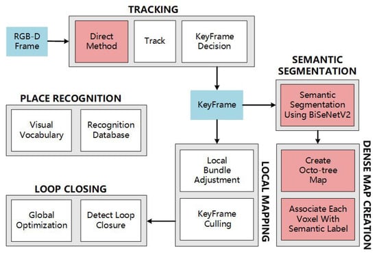 The framework of our system. The blue boxes represent the important data to be processed in the system, the red boxes represent the new parts added to the original framework, and the white boxes include the local mapping thread, loop closing thread, and place recognition parts, which are the same as ORB-SLAM2.