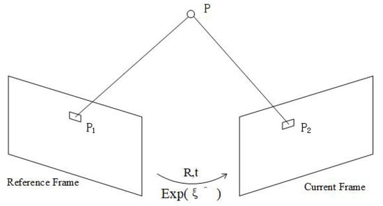 The direct method for the pose solution procedure was proposed and developed some time ago [58], and the process we used for the pose solution was similar to the process used in SVO [17]. As shown in Figure 3, the approach uses the initial key frame as a reference frame, then extends a feature point obtained in the reference frame to a position in 3D space with the same depth as the corresponding map point. The extension point at that position is P. Then the extension point P is projected onto a new frame, the current frame, and the corresponding projection point on the current frame is obtained. The equations for the projections of the two points are shown in Equations (1) and (2):