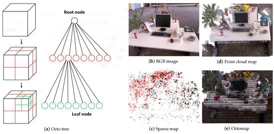 Explanation of the octo-tree method and its properties.(a) Octo-tree: just as a tree root can grow leaves, a large voxel can be subdivided into multiple small voxels, and the 3D space composed of multiple voxels can also be subdivided to present more information [47]. (b) RGB input image: an example input image in the public dataset TUM [61]. (c) Sparse map: a map composed of sparse feature points in the original ORB-SLAM2 [12] as input to (b). Clearly, it is difficult for humans to recognize the map content. (d) Point cloud map: a form of dense map generated using the images in (b). Humans can recognize the map content, but the large storage space and inability to navigate make it unsuitable for small intelligent robots. (e) OctoMap: the dense map form used by our system, which is computationally economic and also efficient for navigation [47].