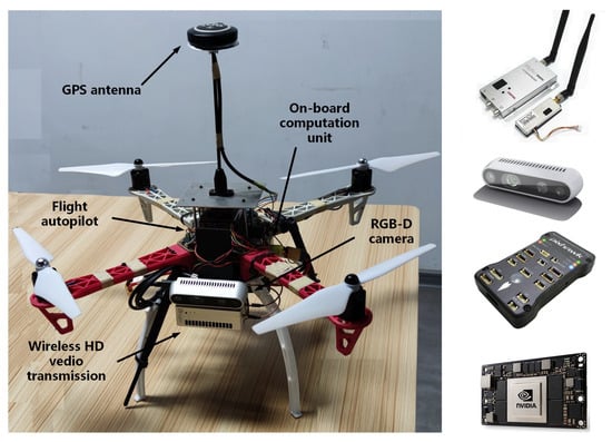 To test the performance of the proposed system on a real robot, we built a UAV platform as shown in Figure 5 to conduct flight experiments in a real environment. The UAV was based on a F450 quadrotor airframe, equipped with a Pixhawk running ArduPilot firmware as autopilot, and an XBee radio module for GCS (ground control station) telemetry. The primary payload of the UAV was an embedded AI (artificial intelligence) system, Nvidia Jetson TX2, which was connected to a RealSense D435 camera. The RealSense D435 is an RGB-D camera. It is able to generate RGB images and corresponding depth images. The RealSense D435 was rigidly mounted on the front part of the UAV to capture forward-looking images.