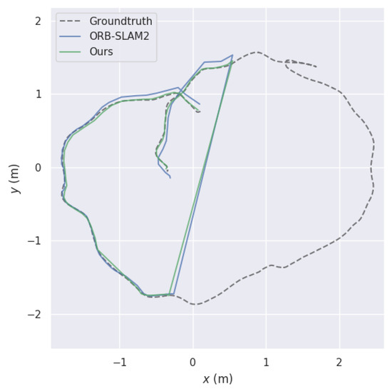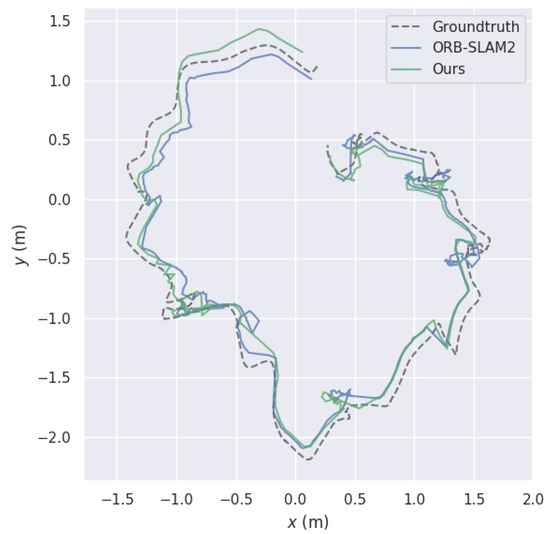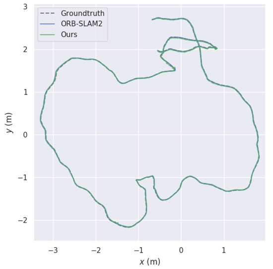 In the RGBD_f3_longhouse dataset, the camera sensor moved without shaking and the entire motion trajectory occurred in a closed loop. As shown in Figure 6, our system and ORB-SLAM2 maintained an accurate pose estimation in a smooth moving environment, and both showed a global optimization, allowing the whole trajectory to be globally corrected through the loopback detection at the back end of the framework. As shown in Table 2, compared with the ORB-SLAM2, the accuracy of our system was not much degraded.