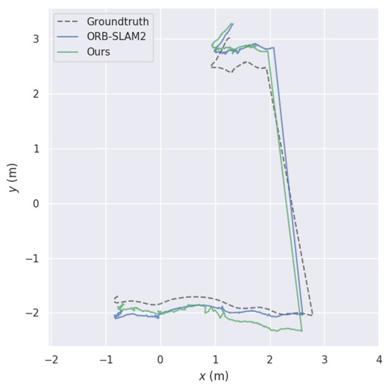 We used the RMSE (root mean square error) of the ATE (absolute trajectory error) [61] to evaluate the accuracy, and Table 2 shows the error results for the estimated pose of the two visual SLAM algorithms compared to the ground truth. Figure 5, Figure 6, Figure 7 and Figure 8 show the comparison of pose trajectories between the ground truth, the ORB-SLAM2, and the proposed system on the different datasets selected. The blue lines represent the estimated trajectory of the ORB-SLAM2, the green lines represent the estimated trajectory of our method, and the gray dashed lines represent the ground truth.
