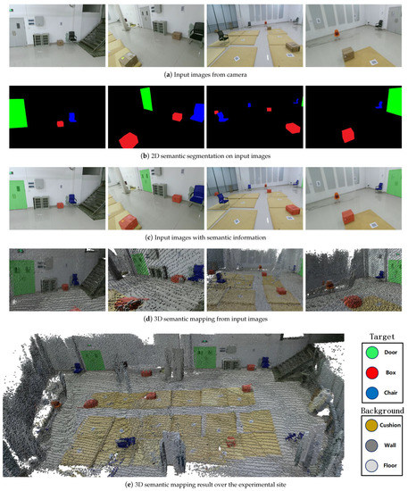 Processing steps and results for the proposed RTSDM. The input images in (a) were acquired by the camera and entered into the system for 2D semantic segmentation as shown in (b), the semantic information was superimposed on the input images as shown in (c), then the system built the local 3D maps of the input images as shown in (d). Finally, the 3D semantic mapping result over the experimental site as shown in (e) was obtained by stitching the pose information.